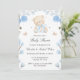 Este convite para o chá de fraldas é adequado para um tema de urso/podemos esperar chá. O design inclui um ursinho de cor d'água com arco azul, duas borboletas e pequenas estrelas, sobre fundo branco com borda floral azul.