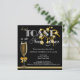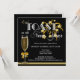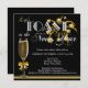 Convite de festas de Ano Novo em preto na moda com champanhe de ouro e fogos de artifício.
