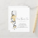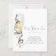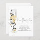 Convite para Véspera de ano novo de Script de Champagne de Orçamento. Um alternativo de 4,5 pol x 5,6 pol com preço inferior. Disponível em um STOCK DE CARTÃO SEMI GLOSS 110 lb, que é a opção padrão (recomendada para convites), OU um SATIN FINISH 80 lb MUITO THIN PAPER STOCK. Os envelopes são um extra opcional e são ligeiramente maiores que o tamanho da placa. Simples elegância com um vidro de champanhe e galhos dourados e negros à esquerda, e o cabeçalho principal em um script de estilo de escrita manual definido. Personalize facilmente o resto do texto para seus próprios detalhes.