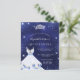 Um convite moderno, na moda e glamouroso para uma Quinceañera, festa de aniversário 15. Um fundo azul da meia-noite com poeira falsa, uma tiara e um vestido. A cor azul é irregular. O nome é escrito com um moderno estilo escrito à mão. Personalize e adicione os detalhes da sua festa.