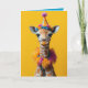 Uma girafa de bebê encantadora vestida para comemorar, vestindo um chapéu festivo com padrões coloridos e decorações fofinhas. A girafa estiva uma jiboia de penas multicolorida e fluída, e se posiciona contra um fundo amarelo brilhante, criando uma cena alegre e caprichosa.