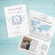 Moderno e Elegante Mapa do Mundo Convite Destino Casado, como passaporte com monograma floral de cor azul empoeirado