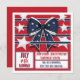 Convite de festa divertido para 4 de julho em vermelho, branco e azul, apresentando um laço azul-marinho fofo com estrelas brancas. O laço está sentado entre listras azuis patrióticas e estrelas brancas contra um fundo vermelho ousado. O verso deste convite de festa personalizável oferece espaço extra para informações para seus convidados no aniversário da América. Aproveite sua festa!