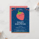 Surpreenda seus convidados com este chá de fraldas bonito convidam a caracterização de uma morango adorável com elementos vibrantes contra um fundo azul. Adicione simplesmente seus detalhes do evento neste modelo fácil de usar para fazer-lhe um convite um--um-amável. Lance o cartão sobre para revelar um teste padrão vermelho e branco elegante das listras na parte de trás do cartão.