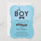 Este convite elegante do chá de fraldas caracteriza um tema pequeno do homem. Características deste design na moda as palavras "oh" com um laço elegante sob a letra "O". O fundo azul tem um inclinação subtil para um efeito macio. Este cartão moderno é perfeito para mamã-à-estar que espera um bebé.