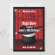 Uma ilustração gráfica do chapéu de mágico com fundo de cortina vermelha, apresentada pelo artista/designer Charmaine Paulson, num convite personalizado. O convite tem modelos de texto para a sua personalização.