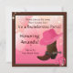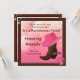 Uma ilustração gráfica de chapéu de cowgirl e botas de cowgirl com balões de festa em um convite personalizado. O convite tem modelos de texto para sua personalização. Arte original: Copyright Charmaine Paulson