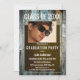 Convite de festa de formatura com sua própria foto em um fundo de madeira marrom-escuro e azul-curada.