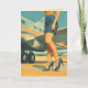 Um piloto na moda num uniforme azul-marinho e salto alto permanece confiante ao lado de um avião antigo, exuando sofisticação e atração por viagem.