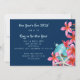 Convite de festas de novo ano com tema tropical. Azul marinho com grande ornamento e flores de plumeria rosa design. O texto é azul claro e fácil de personalizar para sua festa de feriado.