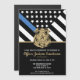 Este design apresenta uma bandeira da polícia com listras pretas e brancas, e uma fina faixa azul de linha também. O crachá da polícia e o texto do ouro estão acima de todos os detalhes do partido para os detalhes do polícia aposentado, xerife, capitão ou chefe do partido aposentado.