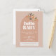 Ao inspirar-se na design do século médio e minimalista, este convite trará uma sensação de "boho chic" para o seu evento. Ideal para um chá de fraldas, um brunch para bebês ou um chá alto - você pode personalizar a descrição para se adequar ao seu evento! Manchete: "Olá, Bebê". Tons cor-de-rosa e bege e sotaque floral.