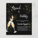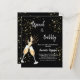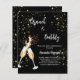 Um convite moderno, na moda e glamouroso para um Chá de panela de bolinho. Um fundo preto com bolhas, um par de flautas, óculos. O nome é escrito com um moderno estilo escrito à mão. Personalize e adicione os detalhes da sua festa. 1 folha = 1 convite impresso de borda a borda.