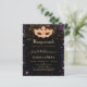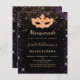 Para uma elegante Quinceañera, festa de aniversário com tema 15 Mascarada. Um fundo na moda preto. Decorado com pó de ouro falso roxo e poeira brilhante e uma máscara de mascarada ouro. Personalize e adicione um nome, idade e detalhes da festa. O nome é escrito com um script de estilo manuscrito