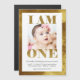 A letra de água dourada moderna "I AM ONE" destaca a foto do convite magnético primeiro aniversario do seu bebê. Disponível em outras combinações de cores, você pode facilmente adicionar detalhes de sua parte a este primeiro modelo de convite de aniversário.