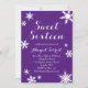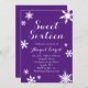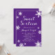 Uma aspersão de flocos de neve decora este divertido convite de festas dos Dezesseis, em fundo roxo profundo. Se forem necessários itens de coordenação adicionais para o seu evento, entre em contato conosco em prettyfancyinvites@gmail.com com sua solicitação.
