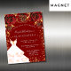 Um moderno, na moda e glamouroso ímã de convite para uma Quinceañera, festa de aniversário 15. Um fundo vermelho com poeira brilhante dourada falsa, um vestido branco e rosas vermelhas, florais. O nome é escrito com um moderno estilo escrito à mão. Personalize e adicione os detalhes da sua festa.