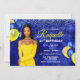 Convite projetado para aniversários, doces dezesseis, casamentos, aniversários, solteironas e outros eventos de festas com um tema real azul e amarelo, destacado por vários balões nessas cores nos cantos, sobre fundo de brilho azul e folha metálica.