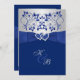 Este monograma de cinza azul real e prateada floral juntou corações convite 2 tem uma fita azul IMPRESSA SOBRE fita e arco, com um par de brilhante FAUX IMPRESSO e joia de diamante unindo corações. Todo o texto é personalizável. Se você precisar de outros itens neste estilo design, envie um email para niteowlstudio@gmail.com para solicitá-los.
