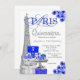 Convite de aniversário 15 da Quinceanera de Paris doce com a linda Torre Eiffel prateada, pacotes elegantes de presentes em Paris, calçados de salto alto com brilho prateado e roteiro de Paris azul-real rico em um rico fundo floral azul. Este belo convite da Quinceanera Paris é facilmente personalizado para o seu evento simplesmente adicionando os seus detalhes no estilo de letra e cor, e a redação da sua escolha. Este é um design impresso sem diamantes reais, joias, brilho, etc.