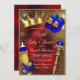 Chá de fraldas do príncipe real com bonito coroa azul e dourada e coisas do bebê em um belo fundo vermelho e dourado. Você pode alterar o texto conforme necessário para o seu evento. Impressão em papel brilhante para obter melhores resultados.