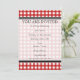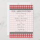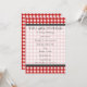 Um convite com um fundo de gingham vermelho. Seções do centro com caimento preto. Personalize com suas informações. O lado oposto apresenta um fundo de gingham sólido com o texto "Você é Convidado", moldado por dentro com forma de círculo com forma preta.