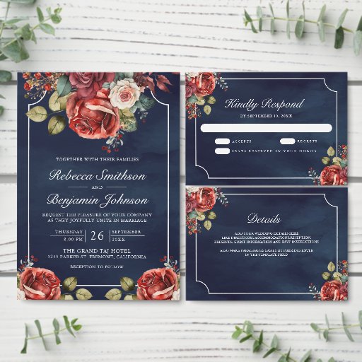 Convite Red Roses Floral Frame Navy Blue QR Code Wedding