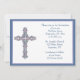 Convite cristão com ornamentado azul e cruz roxa. Este convite é adequado para a primeira comunhão sagrada, confirmações, batismos ou batizados. Pode ser facilmente personalizado com os detalhes do evento. Os convites são concluídos com envelopes.
