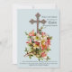 Um fundo azul em pó contém uma cruz de prata escura cercada por um aglomerado de glândulas de coral e azáleas brancas. Um convite religioso para qualquer reunião de primavera.