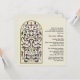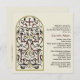 Um design formal que representa uma janela de vidro arborizado e manchado com formas complexas. Uma cruz distinta está centrada no topo deste belo convite quadrado. É adequado para as celebrações do Batismo, do Natal, da Primeira Comunhão Sagrada e da Confirmação ou para quaisquer outros eventos religiosos. br/>O convite é fácil de personalizar com seu texto, fonte, cor da fonte e escolha de seis tipos de papel.