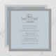 Um convite elegante e sofisticado em um azul macio com uma beira cinzenta. O cartão caracteriza um encabeçamento decorativo com uma janela circular para um monograma, uma cruz, uma data, etc. É flanqueado pela folha abstrata. (FP)