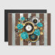 Relógio antigo e patenteado, adornado com joias, mãos de ouro e algarismos latinos com rosa de turquesa sobre fundo castanho e listrado. Estilo Steampunk.