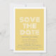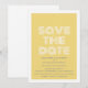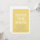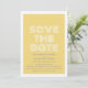 Anúncio Retro para Salvar a Data em amarelo e branco com um design de tipografia moderna e funky. Este convite para salvar a data é moderno e elegante, e fácil de personalizar com os detalhes do seu casamento. Para mais opções de personalização, clique no botão Personalizar.