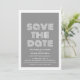 Anúncio Retro para Salvar a Data em cinza e branco com um design de tipografia moderno e funky. Este convite para salvar a data é moderno e elegante, e fácil de personalizar com os detalhes do seu casamento. Para mais opções de personalização, clique no botão Personalizar.