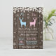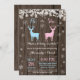 Winter Deer Gender Reveal Invitation. Floco de neve branco. Ele ou ela. Garoto ou Garota. Rosa e Azul. Homem de Gingerbread de Natal. Fundo Da Madeira Rústica. Campo de Vintage Retro Barn.