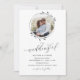 Este elegante convite de casamento fotográfico mostra sua foto no topo cercada por uma simples coroa de cinza de carvão. É combinado com um roteiro de caligrafia romântico.