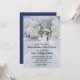 Convite de casamento com uma pintura de uma paisagem maravilhosa de inverno com um casal com guarda-chuva. Os flocos de neve em forma de coração são opcionais (você pode clicar no ícone de olho da imagem superior no painel de edição avançada). Também é possível substituir o verso por sua própria foto. Este convite tem um cartão RSVP correspondente e faz parte de uma coleção.