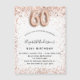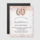 Para um elegante aniversário de 60 anos. Um fundo branco. Decorado com rosa dourado, cintilação falsa rosa, faíscas. Personalize e adicione um nome e detalhes da festa. O nome é escrito com um script de estilo manuscrito, número 60 com fontes de estilo de balão.