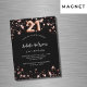 Um fundo preto clássico, decorado com estrelas douradas rosa. Personalize e adicione um nome e detalhes da parte. O número 21 é escrito com um script de estilo de balão.