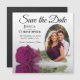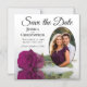 Estes modernos cartões salve a data magnéticos florais são uma maneira maravilhosa de deixar seus amigos e família saberem sobre seu próximo casamento. Eles apresentam um belo design que é romântico e elegante com um solteiro roxo ou rosa cor-de-rosa magenta, roxo ou magenta, refletindo em uma piscina de água com ondas e ondulações e sua foto em um quadro em forma oval em um fundo branco clássico. A legenda: Salvar a data com espaço para seus nomes, data e local.