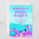 Celebre seu aniversário de verão com este convite de festas de piscina fofo. Fácil de alterar o texto da página do produto. Tema de verão divertido com anéis flutuantes de piscina e bola de praia.
