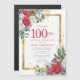Belos rosas vermelhos e brancos estão aninhados em folhas de preto e eucalipto para criar um elegante display floral. Eles decoram uma grande estrutura de ouro e são aplicados com poeira de confete de ouro. Celebração do centésimo aniversário e nome da pessoa estão escritos em um grande texto vermelho. Todo o texto pode ser editado. Escolha perfeita para uma celebração especial de aniversário no inverno.