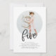 Um convite de aniversário de 5 moderno com uma fotografia redonda e a palavra 'cinco' numa letra de estilo caligráfico, perfeito para a Festa de aniversário de 5 do vosso filho!