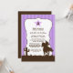 A festa de aniversário desta menina 5x7 convida tem um tema da vaqueira. No fundo, há listras roxas com uma silhueta de uma vaqueira que monta um cavalo com um cacto na paisagem. No meio, há um quadro que tenha sua informação customizável da festa de aniversário no meio. Gráficos por Corazón Dulce em MyGrafico