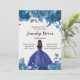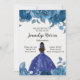 Este é um convite para um evento quinceañera, com a cor azul real como sua matiz primária. Uma figura de uma boneca tradicional da quinceañera foi incorporada à design para melhorar a aparência geral e o ambiente dessa celebração especial.