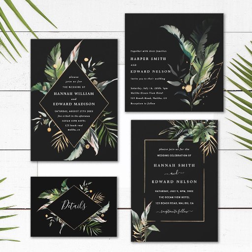 Convite RSVP Preto para Casamento de Folhagem Trop