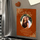 These beautiful wedding save the date cards feature an elegant rust orange or burnt sienna and gold design with your photo in an oval shaped frame with ornate golden curls and swirls in the corners. The title is written in elegant script lettering and there is space for your names, the date, and wedding location. Great way to make it easy for your friends and family to remember your upcoming wedding date. The magnetic back makes these cards easy to display on a refrigerator or other metal surface.