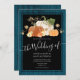 Bombas de aquarelas com elementos de brilho. Convites de casamento para guião elegantes. Celebrações de outono. Fundo texturizado de madeira azul-country.