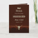 Country western cowboy come bebida casada com madeira marrom anúncio de casamento cartão dobrado vertical. Crânio de touro russo. Usem um pouco de humor com estes bonitos e engraçados convites ao estilo da fazenda. Coma, Beba, porque estamos nos casando pode ser personalizado. Trendy, antigo design de estilo antigo selvagem de vintage. Legal animal fazenda. Personalize sua tipografia. Imagem copyright Marg Seregelyi Fotografia.