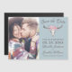 Envie este elegante casamento temático, salve o ímã do anúncio de fotos para a família e amigos para anunciar sua noivado de casamento. O design de inspiração moderna apresenta sua foto à esquerda e à direita é um crânio de vaca pintado manualmente vestindo uma morada floral cor-de-água rosa e pincelada sobre um fundo de madeira cinza azul curvada. Acima do crânio da vaca, lê-se "Salve a Data" e abaixo estão os seus nomes e a data do casamento na tipografia da escrita negra para personalizar. Desenhada pela artista Susan Coffey.